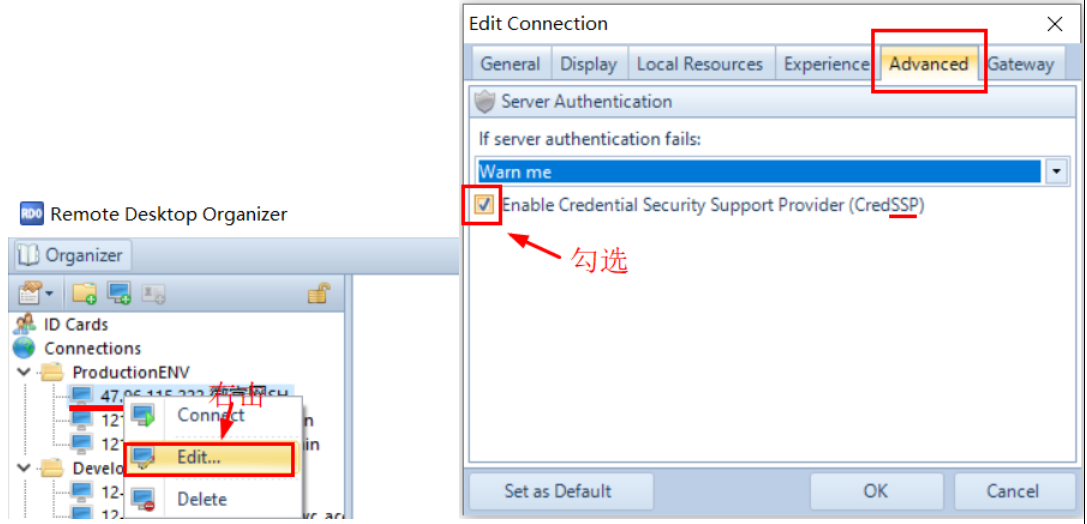 3. 直接启用RDO的高级配置CredSSP,使得RDO具有身份验证功能【完美解决】: —— 强烈推荐,兼顾安全和兼容性